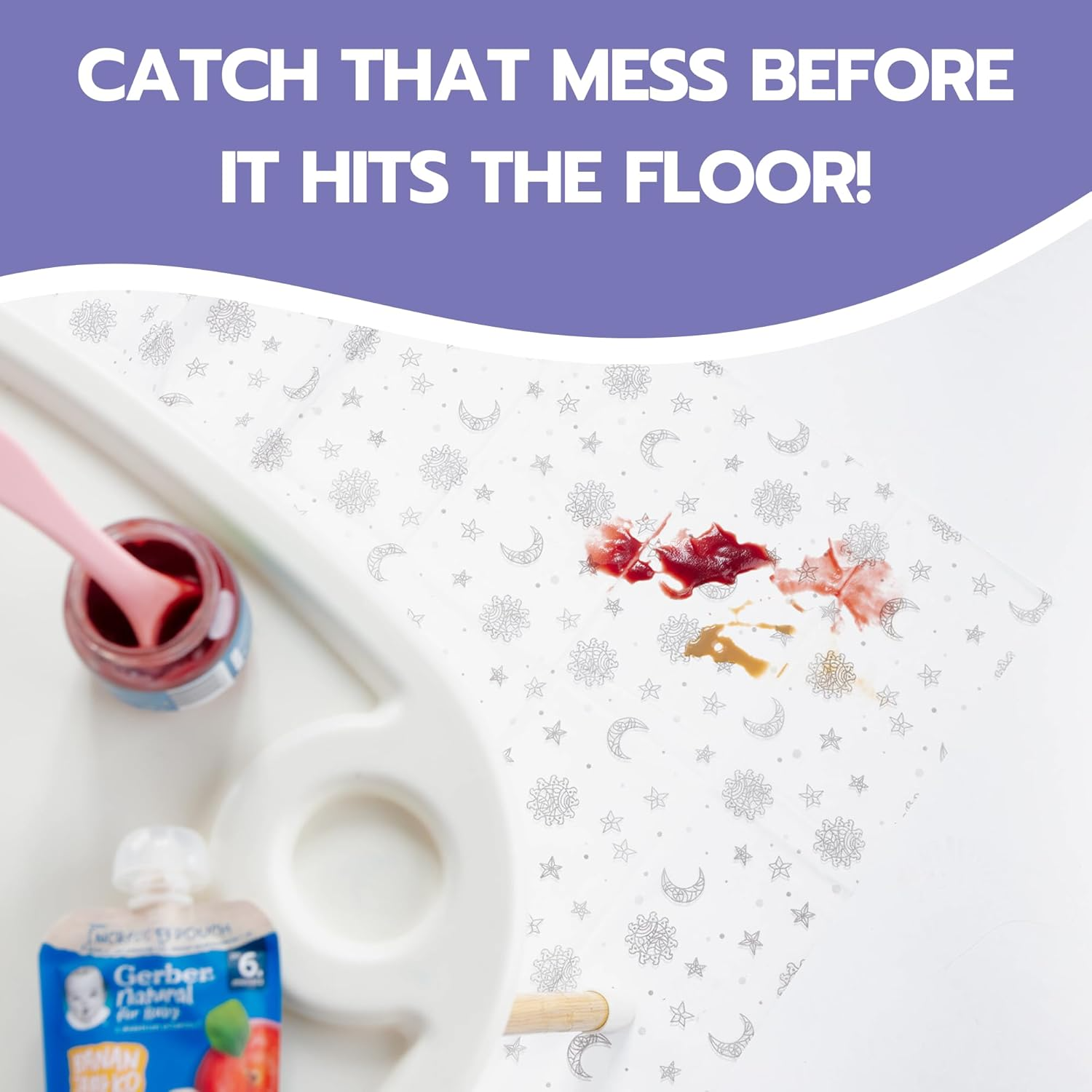 Each sheet of the disposable high chair floor mats are individually folded to fit easily into your bag, making it ideal for use at home or on the go. Simply toss the high chair splat mat after use for quick, hassle-free cleanup. That’s one less thing for you to worry about!